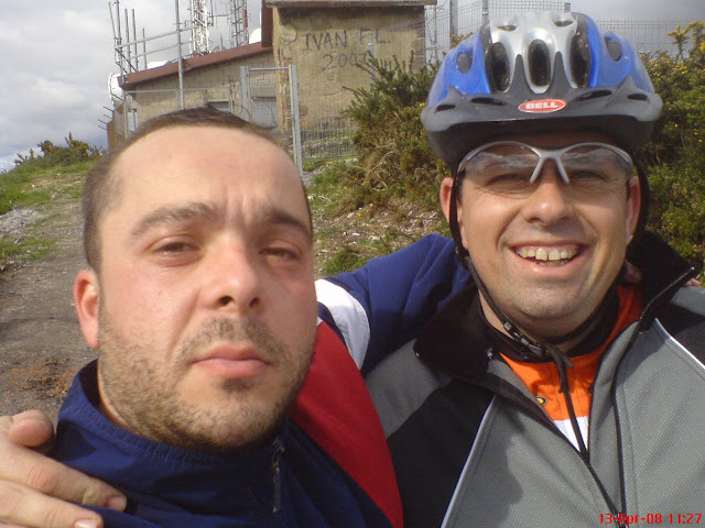 El ritmo es lento, sin cebarse, ya que hemos ido a endurecer las piernas un poco. El sol asoma a ratos entre los arboles e ilumina las cuestas arribas que vamos tomando con el zigzag de las curvas en la ascensión. Cada vez se ven mas cerca las antenas. A mitad de camino, parada técnica. Un problema de salud estomacal obliga a la mitad del grupo a bajarse de la bici y evacuar todo el peso que lleva en la mochila. Demasiado aire para parar ahí arriba. Reanudada la marcha, paramos en una bifurcación de caminos por los cuales se puede ir para llegar a la cima. Tomamos el único camino a la cima. Las ultimas cuestas son las que se hacen mas duras, pero una vez arriba, con la satisfacción del deber cumplido, nos comemos el bocata a la vez que quedamos encantados con las vistas de las nieves al fondo. Algunos intentan situar el Santu Firme en el horizonte, siendo imposible. Otros, se dedican a ver el mar mas allá de las costas de Candas, Luanco, Avilés, Piedras Blancas y el Aeropuerto.