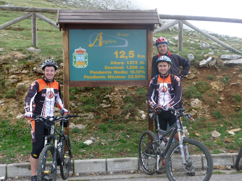 Subida al Angliru: Los 8 km (eran 8, no 7) en 1:40 de subidita por los consabidos desniveles que todos hemos visto en la tele. Asfalto, mucha gente subiendo en coche mirando incrédula al pavo ese de 1´90 con medias azules que subía en bici. Y nada, llegamos arriba haciendo una parada técnica y otra para hacer fotos en lo de las cabritas.